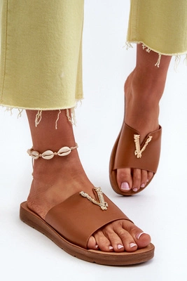 Klapki Damskie Z Ozdobą Eko Skórzane Na Płaskim Obcasie Brązowe Sadria