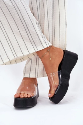 Klapki Damskie Z Transparentnym Paskiem Na Koturnie Czarne Meltiana