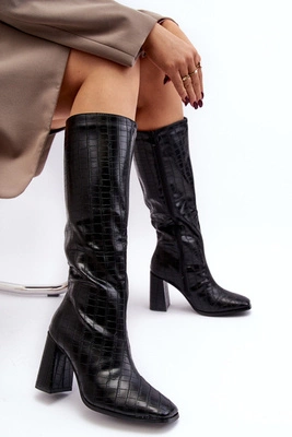 Kozaki Damskie Na Słupku Z Ozdobnym Tłoczeniem Czarne Vabaria