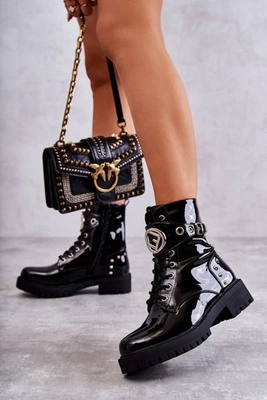 Lakierowane Damskie Botki Z Ćwiekami Czarne Leticia