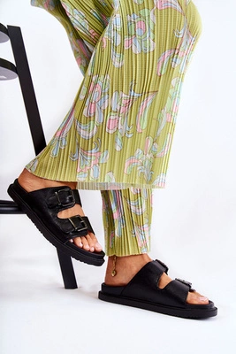 Damskie Skórzane Klapki Z Klamrą Czarne Devia
