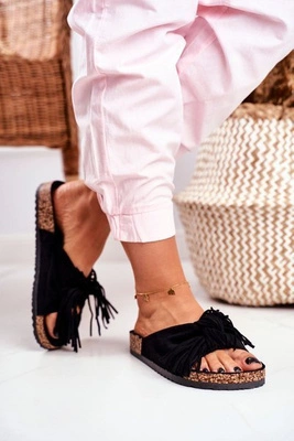 Damskie Czarne Klapki Na Korku Frędzle Marina