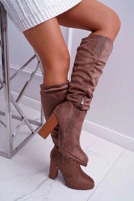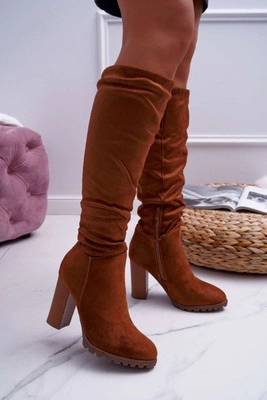 Kozaki Damskie Na Słupku Zamszowe Camel Classy