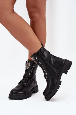 Botki Workery Z Biżuteryjną Ozdobą Ocieplane Eko Skórzane Czarne Miryssa