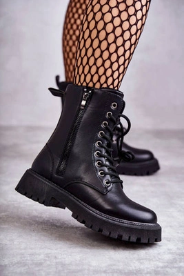 Skórzane Ocieplane Botki Workery wiązane Czarne Maria