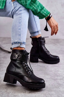 Wysokie Ocieplane Damskie Botki Wiązane Czarne Darla