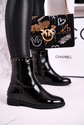 Damskie Ocieplane Botki Na Koturnie Lakierowane Czarne Performance