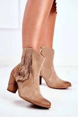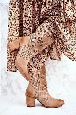 Botki Damskie Na Słupku Skórzane Welurowe Kowbojki Exquisite Beżowe 1170