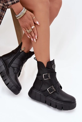Skórzane Ocieplane Botki Damskie Na Platformie Z Klamrami Vinceza 66842 Czarne