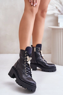 Skórzane Botki Workery Damskie Z Motylem Czarne CheBello 4590