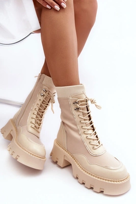 Skórzane Szurowane Masywne Workery Botki Damskie Beżowe Seloma