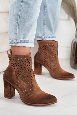 Ażurowe Botki Na Słupku Zamszowe Exquisite 1219 Koniak