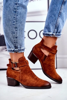 Botki Damskie Na Słupku Skórzane Welurowe Kowbojki Exquisite Brązowe 1170