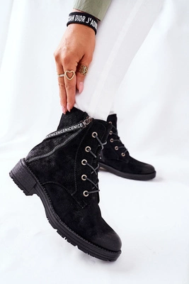 Damskie Ocieplane Botki Workery Z Dżetami Zamszowe Czarne Lu Boo