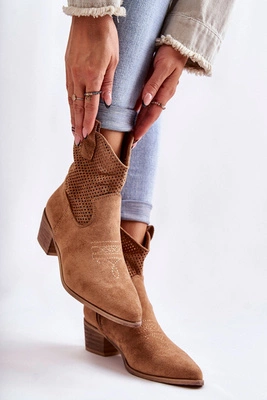 Zamszowe Ażurowe Botki Kowbojki Z Przeszyciem Camel Elvire