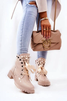 Lakierowane Ocieplane Workery Z Perełkami Beżowe Perla