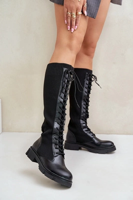 Sznurowane Kozaki Z Elastyczną Cholewką Czarne Vamilena
