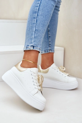 Sneakersy Damskie Na Platformie Z Ozdobami Biało-Złote Lerissna