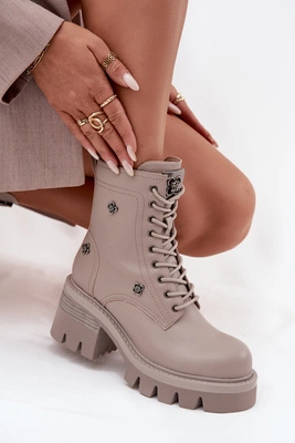 Skórzane Botki Workery Damskie Na Klocku Z Przypinkami Artiker 57C0181 Beżowe