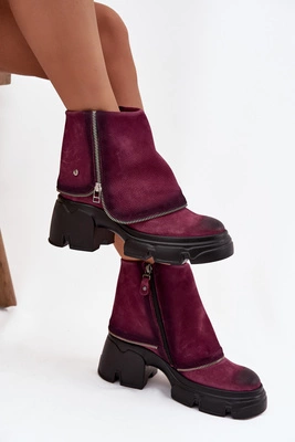 Skórzane Botki Damskie Z Wywiniętą Cholewką Maciejka 07145-23 Bordowe