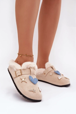 Kapcie Damskie Z Ozdobami I Klamrą Ocieplane Futerkiem Beżowe Thalora