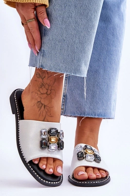 +2Damskie Klapki Z Kamieniami S.Barski KV-2775-31 Biało-Srebrne