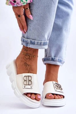 +4Damskie Klapki Na Platformie Z Ozdobą Białe Beneca