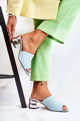 +19Skórzane Klapki Damskie Na Obcasie Niebieskie Perry