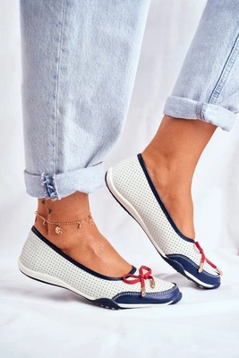 Ażurowe Skórzane Baleriny Biało-Granatowe Erdola
