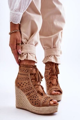Zamszowe Ażurowe Botki Na Koturnie Camel Berthe