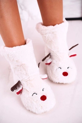Świąteczne Papcie Z Reniferem Ocieplone Kożuszkiem Białe Rudolph