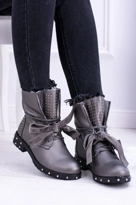 Damskie Botki Ocieplane Z Kolcami i Dżetami Srebrne Neso