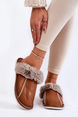 Damskie Skórzane Papcie Z Futerkiem Brązowe Rossa