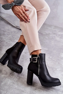 Skórzane Botki Na Obcasie Z Ozdobnym Zamkiem Czarne Rosita