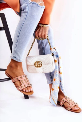 Damskie Skórzane Klapki Z Ozdobnymi Perełkami Beżowe Lasello
