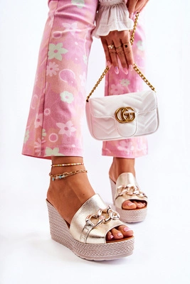 Skórzane Klapki Damskie Na Obcasie Złote Perry