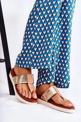 +19Skórzane Klapki Damskie Na Obcasie Złote Perry