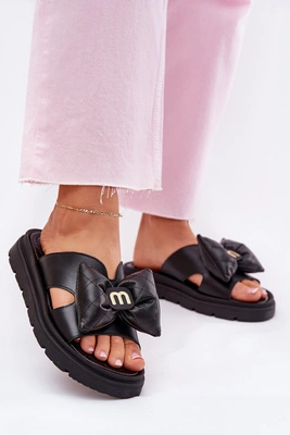 Skórzane Klapki Damskie Na Platformie Z Kokardą CheBello 4647 Czarne
