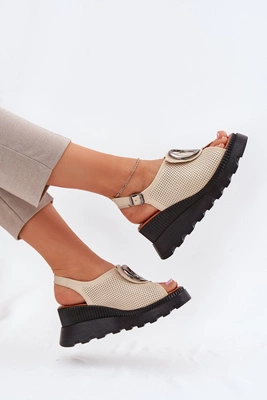 Skórzane Ażurowe Sandały Damskie Na Koturnie Vinceza 79529 Beżowe