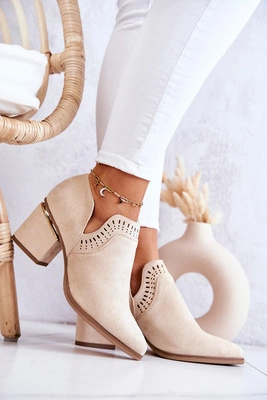 Botki Damskie Na Słupku Skórzane Welurowe Kowbojki Exquisite Beżowe 1170