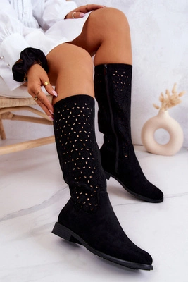 Zamszowe Kozaki Z Ażurowym Wzorem Czarne Darnell