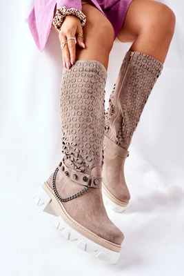 Damskie Skórzane Kozaki Lewski Cappuccino Zamszowe 2866