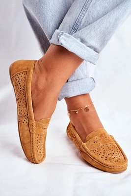 Zamszowe Ażurowe Mokasyny Damskie S.Barski Camel