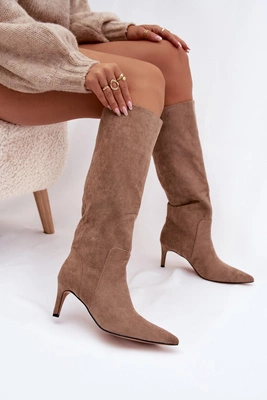 Kozaki Damskie Na Szpilce Ocieplane Z Eko Zamszu Ciemnobeżowe Arelisse