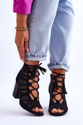 Wiązane Sandałki Na Szpilce Z Motylami Czarne Delmar