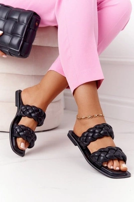Skórzane Klapki Z Plecionką Czarne Love On Top