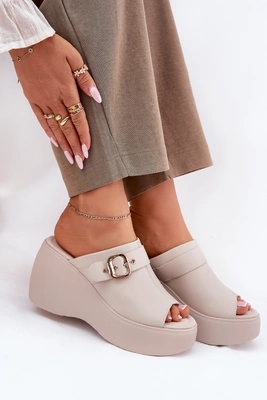 Skórzane Klapki Damskie Na Platformie I Koturnie Z Klamrą S.Barski LR51-542 Beżowe