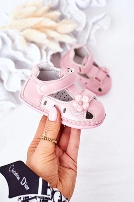 Dziecięce Skórzane Sandałki Na Rzepy Różowe Flowers
