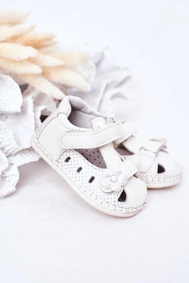 +1Dziecięce Skórzane Sandałki Na Rzepy Białe Flowers