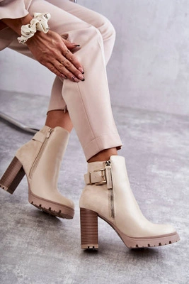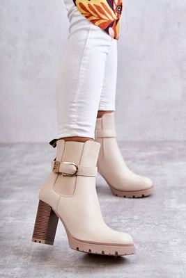 Skórzane Botki Na Obcasie Z Ozdobnym Zamkiem Beżowe Rosita